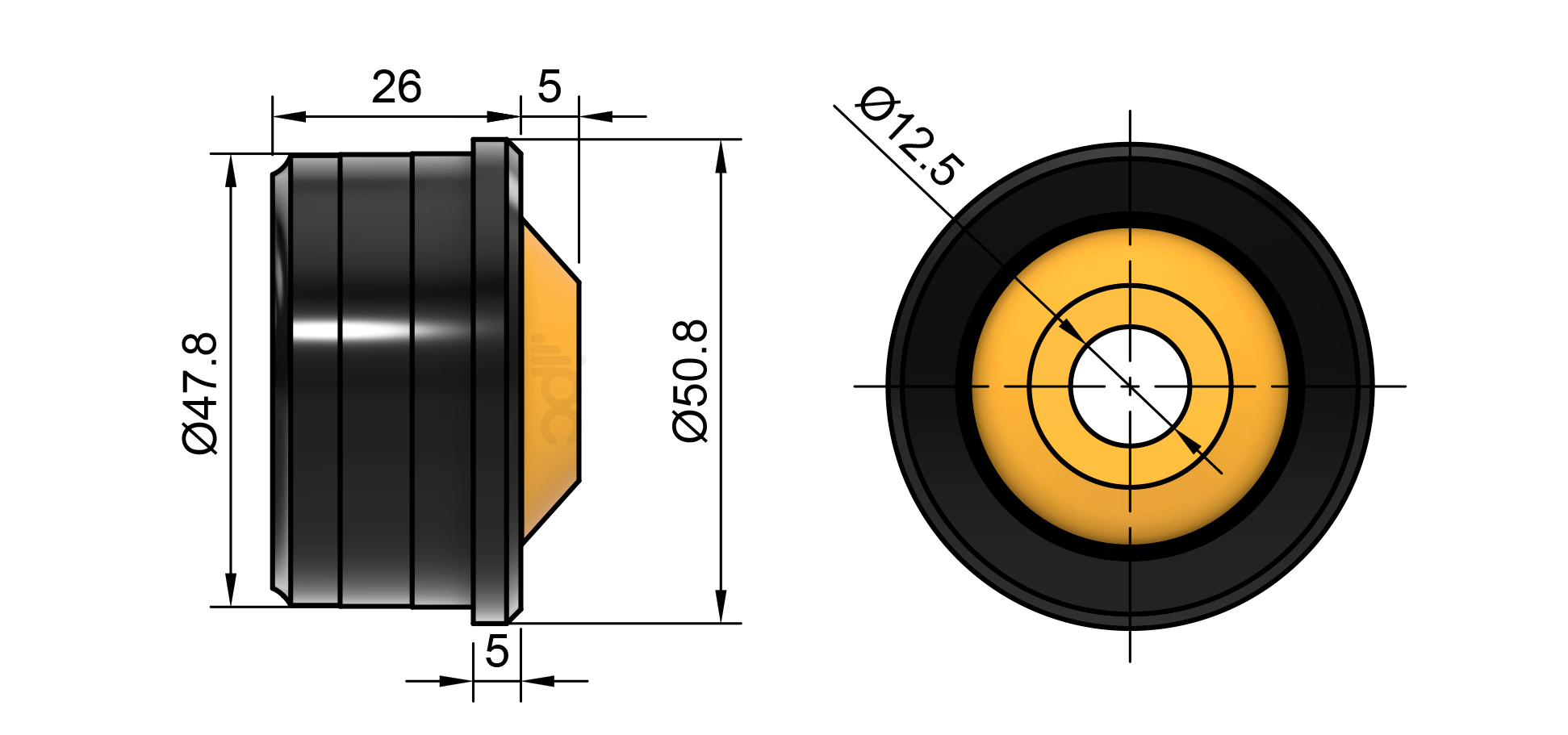 Kit composto por 10 mancais em nylon, desenvolvidos para tubo industrial com diâmetro externo de 50,8 mm e espessura de 1,5 mm. O conjunto inclui rolamentos de precisão e tampas de proteção com furo central para passagem do eixo de 12 mm.