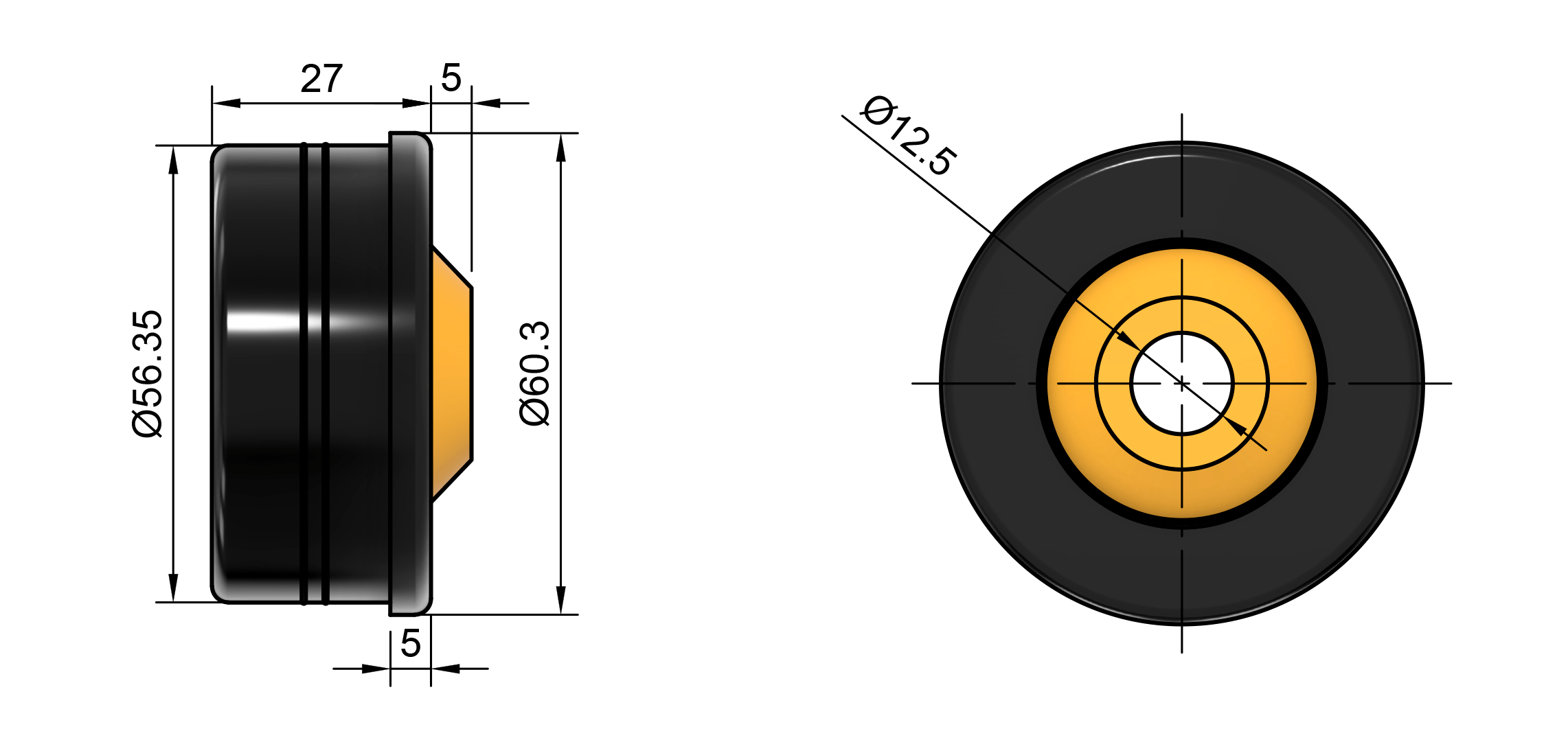 Kit composto por 10 mancais em nylon, desenvolvidos para tubo industrial com diâmetro externo de 60,3 mm e espessura de 2,0 mm. O conjunto inclui rolamentos de precisão e tampas de proteção com furo central para passagem do eixo de 12 mm.