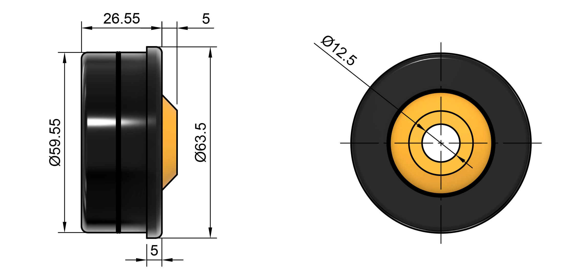 Kit composto por 10 mancais em nylon, desenvolvidos para tubo industrial com diâmetro externo de 63,5 mm e espessura de 2,0 mm. O conjunto inclui rolamentos de precisão e tampas de proteção com furo central para passagem do eixo de 12 mm.