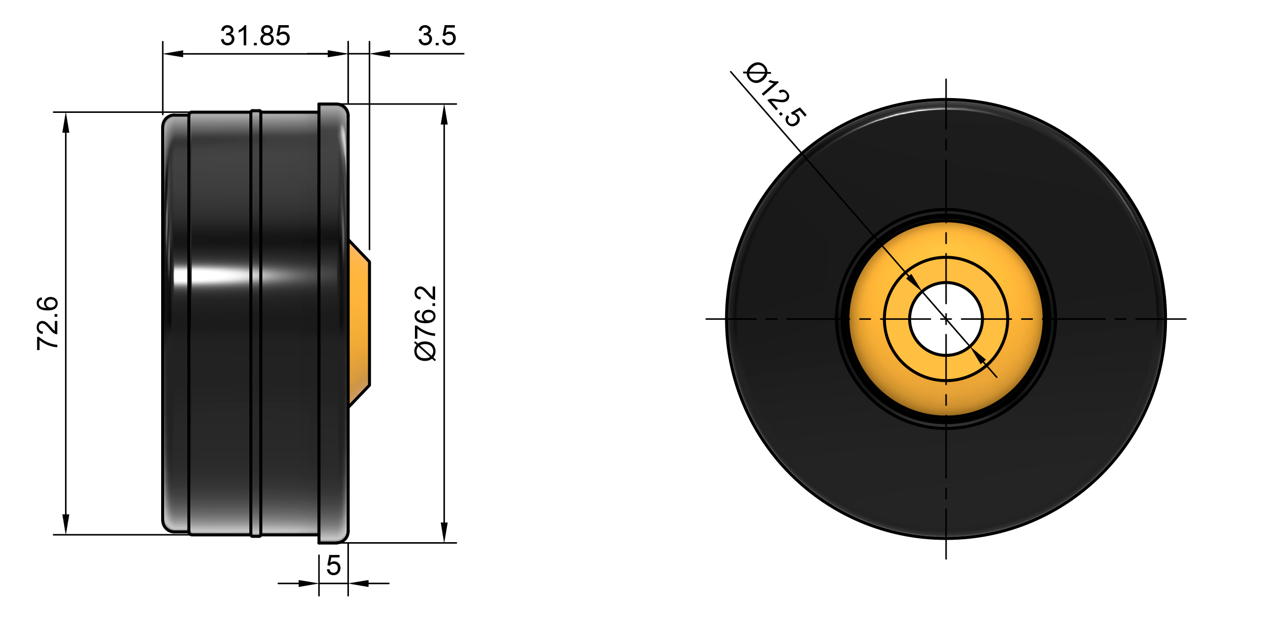 Kit composto por 10 mancais em nylon, desenvolvidos para tubo industrial com diâmetro externo de 76,2 mm e espessura de 2,0 mm. O conjunto inclui rolamentos de precisão e tampas de proteção com furo central para passagem do eixo de 12 mm.